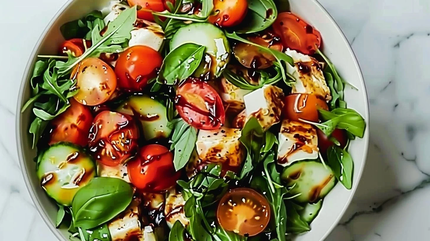 - Drizzle the Dressings: Drizzle about 2 tablespoons of olive oil and the same amount of balsamic glaze over the salad.