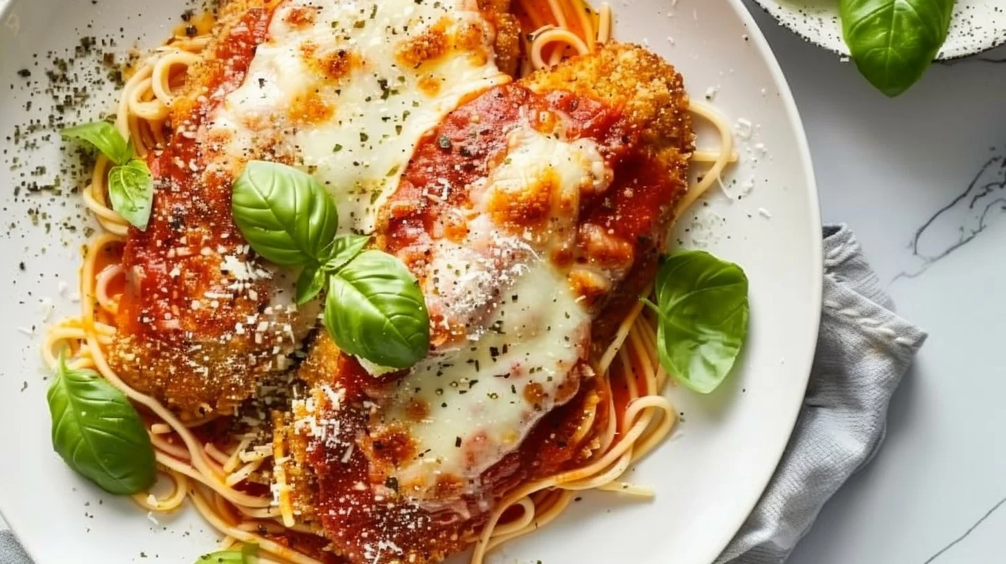 A classic Italian-American dish featuring crispy breaded chicken breasts topped with marinara sauce and gooey mozzarella cheese, perfect for impressing friends and family.