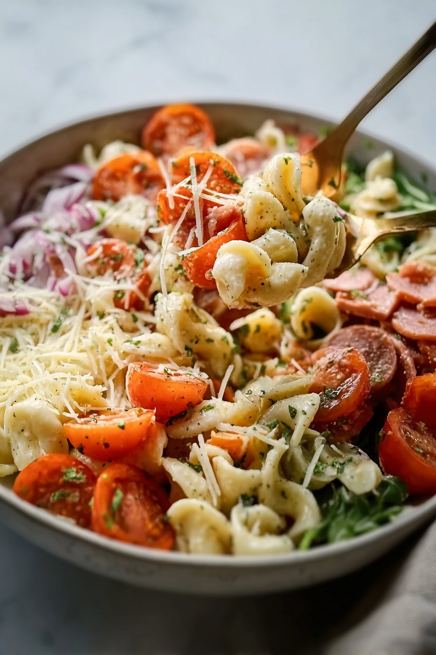• For a vegan version: Substitute cheese tortellini with chickpea or vegetable pasta, use vegan dressing, and replace provolone with vegan cheese or avocado.