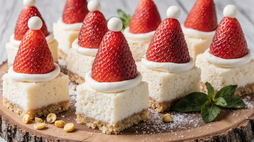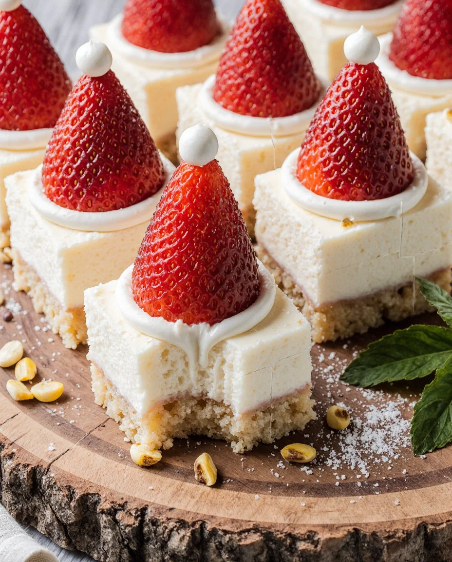 - Once set, arrange the halved strawberries on top of the cheesecake squares to resemble Santa hats.